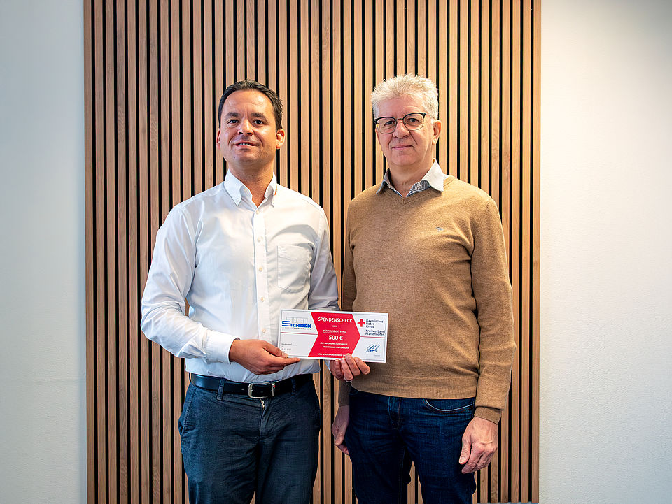 Geschäftsführer Eckhard Schock übergab den Scheck persönlich an BRK-Kreisgeschäftsführer Michael Fochler.
