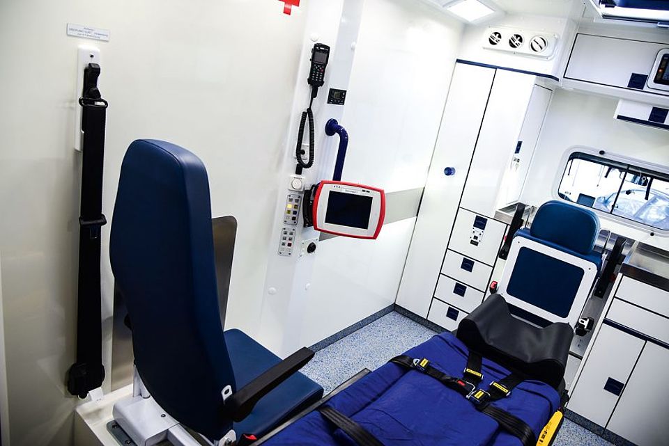 Auch im Innenraum von Rettungs- und Krankentransportwagen wird mit der aktuellen Generation viel dafür getan, dass die Begleiter während der Fahrt sicher angeschnallt sitzen bleiben und trotzdem wesentliche Funktionen wie Licht, Klima, etc. bedienen können. So sind beispielsweise alle neuen RTW und KTW mit einer Wechselsprechanlage zwischen Fahrer- und Patientenraum ausgestattet. Beim Rettungswagen sichert ein spezielles Kamerasystem an der Fahrzeugseite den Rechtsabbiege-Vorgang zusätzlich ab.