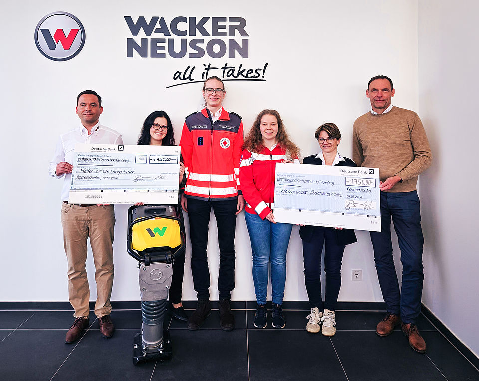 Für Wacker Neuson ist die Verbundenheit mit der Region ein wichtiges Anliegen: Im Rahmen einer Versteigerung innerhalb der Belegschaft wurden im Unternehmen Spenden für gemeinnützige Organisationen gesammelt, die nun an vier Empfänger übergeben wurden: Helfer vor Ort Langenbruck, Wasserwacht Reichertshofen, Heilpädagogisches Zentrum Pfaffenhofen und Kunstzentrum Besondere Menschen Ingolstadt.